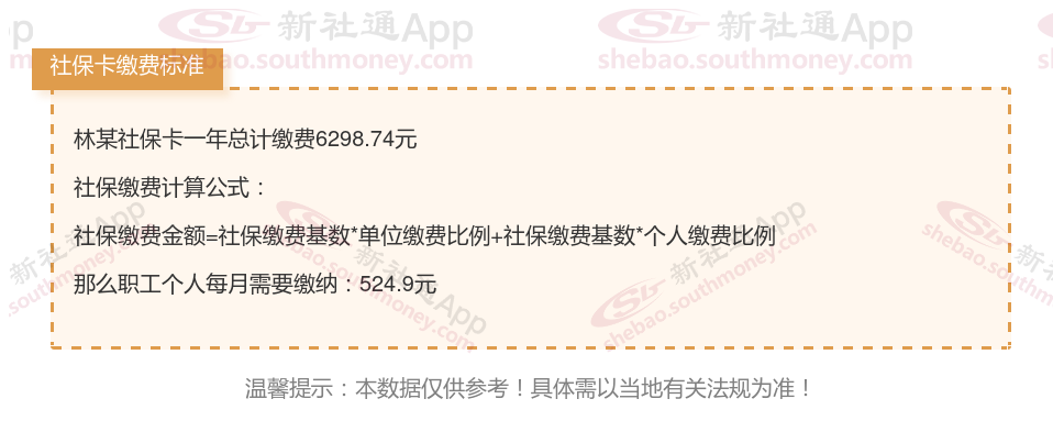 由上图得知,林某社保卡一年需要缴纳6298.74元,个人部分每月需要缴纳524.9元,若您想要了解明细点击新社通社保计算器,来了解一下明细吧。