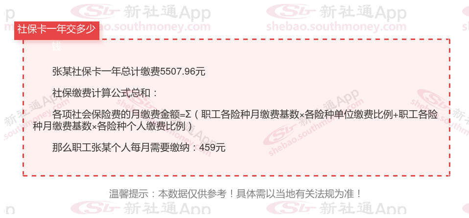 由上图得知,张某社保卡一年需要缴纳5507.96元,个人部分每月需要缴纳459元,若您想要了解明细点击新社通社保计算器,来了解一下明细吧。