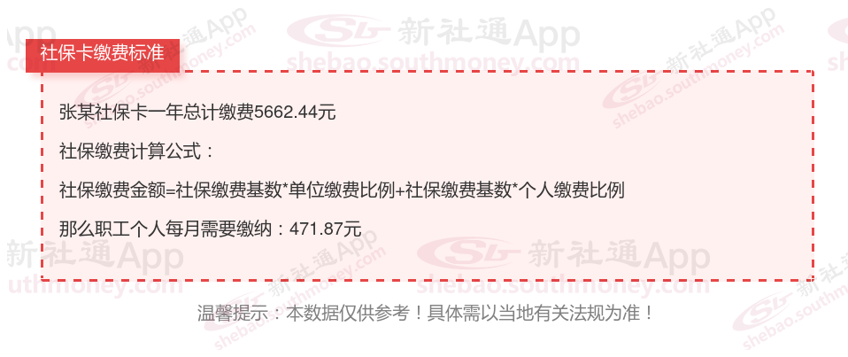 由上图得知,张某社保卡一年需要缴纳5662.44元,个人部分每月需要缴纳471.87元,若您想要了解明细点击新社通社保计算器,来了解一下明细吧。