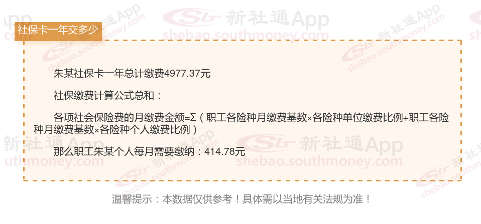 由上图得知,朱某社保卡一年需要缴纳4977.37元,职工个人月缴纳414.78元,若您想要了解明细点击新社通社保计算器,来了解一下明细吧。