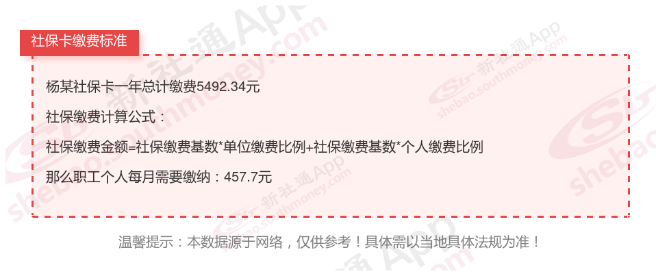 由上图得知,杨某社保卡一年需要缴纳5492.34元,个人部分每月需要缴纳457.7元,若您想要了解明细点击新社通社保计算器,来了解一下明细吧。