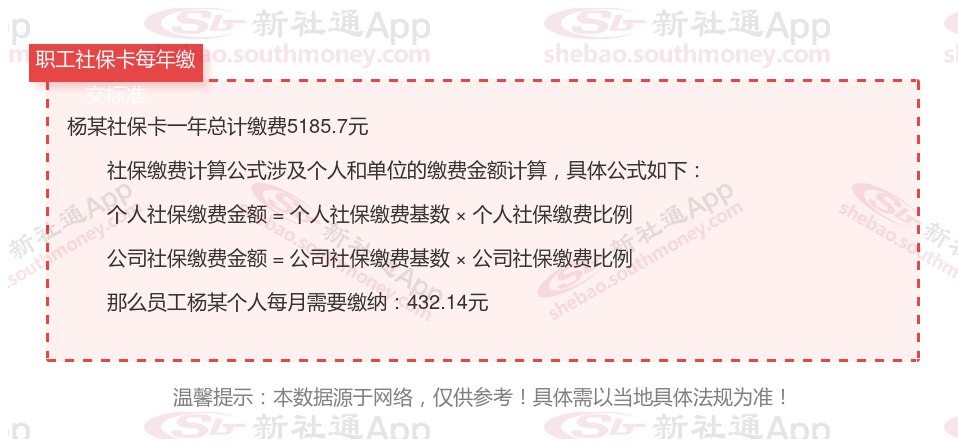 由上图得知,杨某社保卡一年需要缴纳5185.7元,职工个人月缴纳432.14元,若您想要了解明细点击新社通社保计算器,来了解一下明细吧。