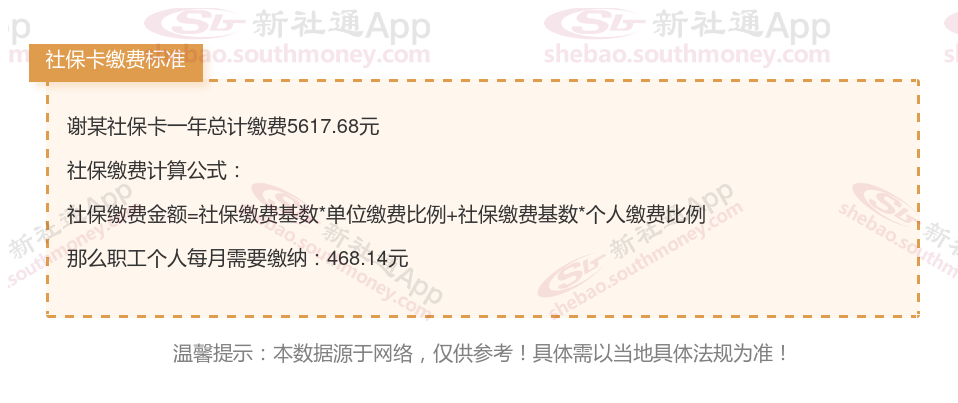 由上图得知,谢某社保卡一年需要缴纳5617.68元,个人部分每月需要缴纳468.14元,若您想要了解明细点击新社通社保计算器,来了解一下明细吧。