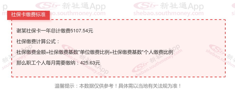 由上图得知,谢某社保卡一年需要缴纳5107.54元,个人部分每月需要缴纳425.63元,若您想要了解明细点击新社通社保计算器,来了解一下明细吧。