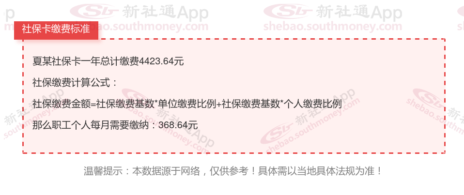 由上图得知,夏某社保卡一年需要缴纳4423.64元,个人部分每月需要缴纳368.64元,若您想要了解明细点击新社通社保计算器,来了解一下明细吧。