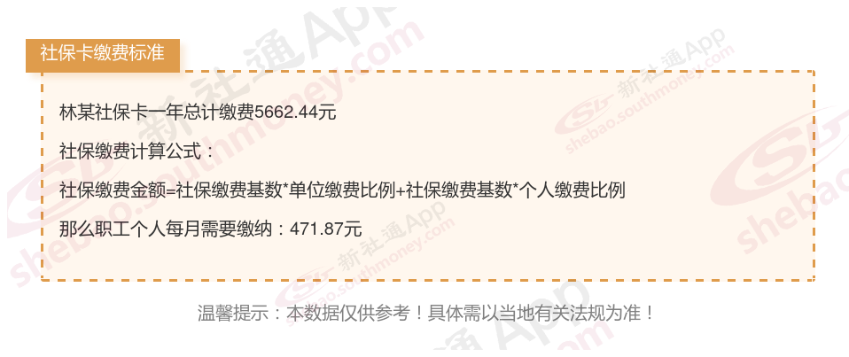 由上图得知,林某社保卡一年需要缴纳5662.44元,职工个人月缴纳471.87元,若您想要了解明细点击新社通社保计算器,来了解一下明细吧。