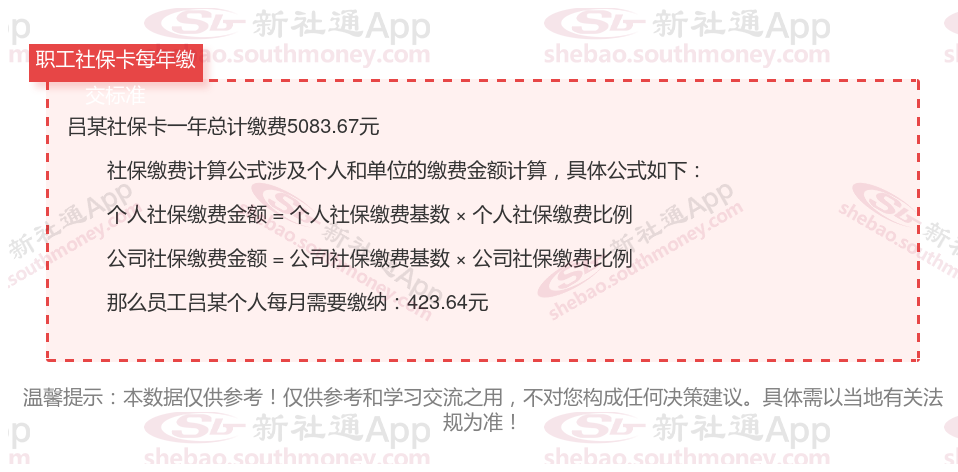 由上图得知,吕某社保卡一年需要缴纳5083.67元,个人部分每月需要缴纳423.64元,若您想要了解明细点击新社通社保计算器,来了解一下明细吧。