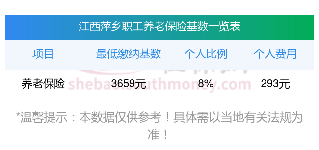 据新社通app获悉,养老保险是为居民退休后的经济来源提供保证的保险,对于单位职工而言,由用人单位和职工本人共同缴纳养老保险,保费较高;而居民的养老保险保费是由居民个人承担。不管是职工养老保险还是居民养老保险,保费都需要通过养老保险缴费基数计算得出。下面随新社通app小编一起来看看江西萍乡养老金缴费标准2023-2024最新基数比例是多少!