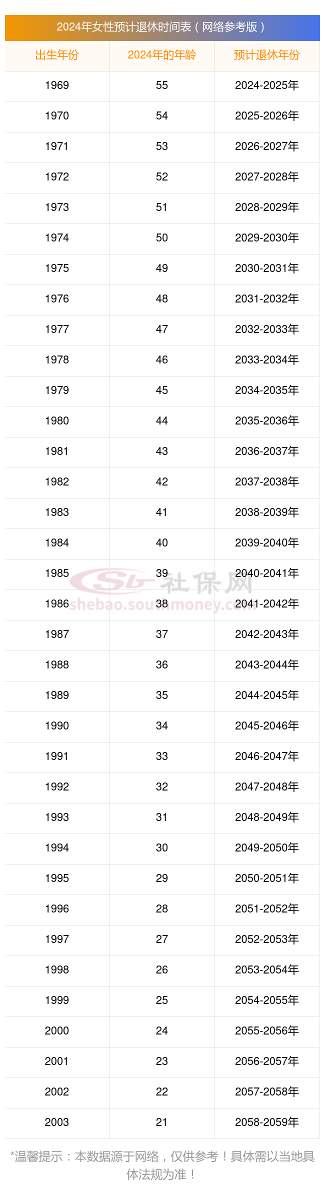 有网友整理了2024年最新男女退休年龄时间表(仅供参考)