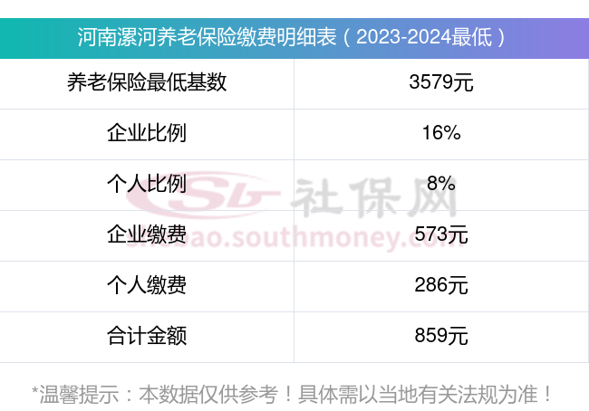 据新社通app显示,河南漯河职工养老保险最低缴费基数为:3579元;单位和个人的缴费比例分别为:16%、8%;
