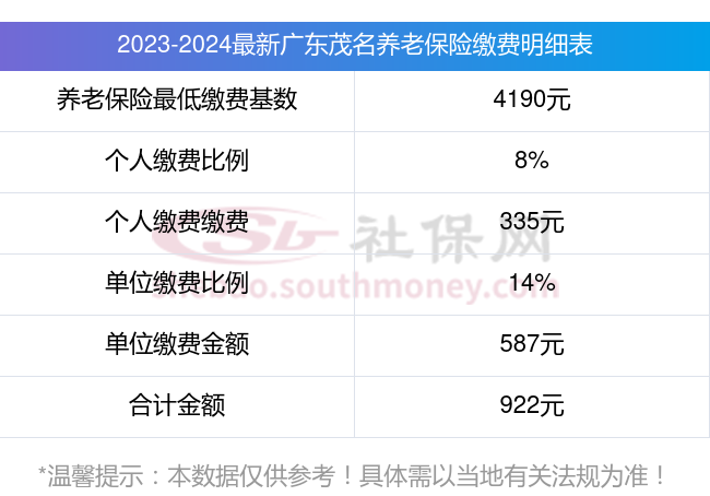 广东茂名养老保险最低缴费基数:4190元;