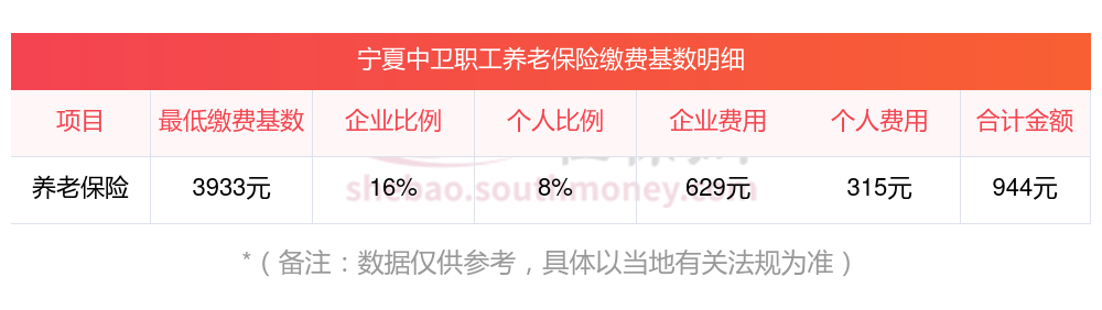 2024年宁夏中卫城镇职工基本养老保险缴费基数的下限为3933元。宁夏中卫职工基本养老保险由用人单位和职工分别按其缴费基数的16%和8%按月共同缴纳。宁夏中卫养老金一个月缴费金额如下: