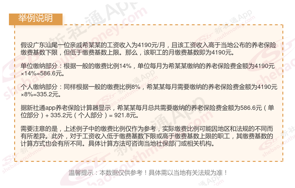 据新社通app显示,2023-2024年广东汕尾职工养老保险的缴费标准是根据缴费基数来确定的:
