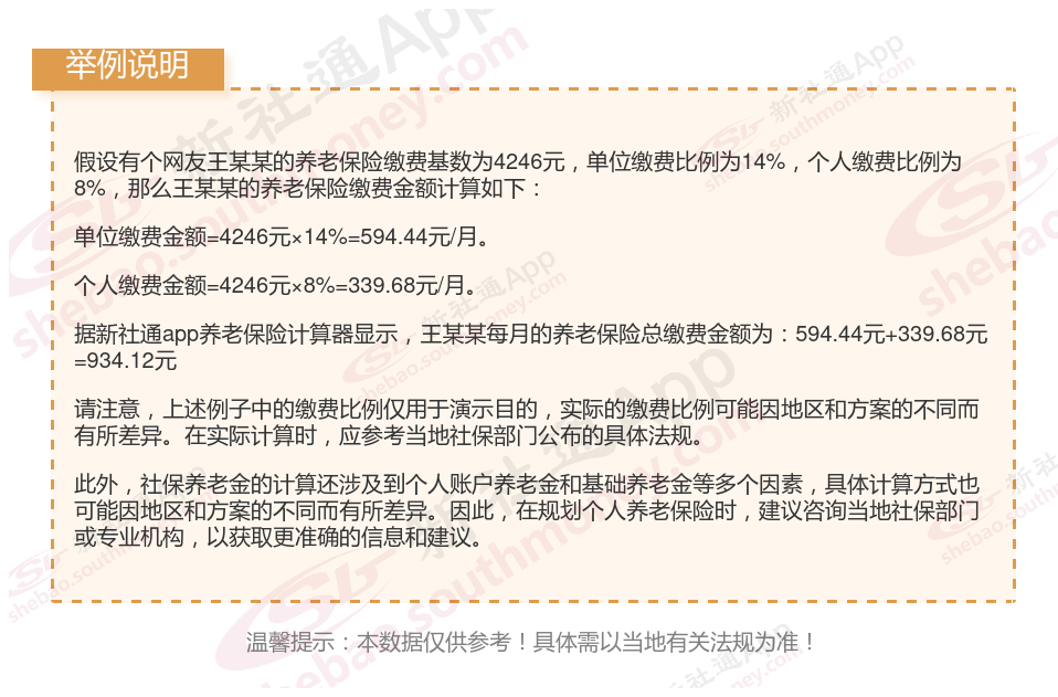 养老缴费基数为:4246,个人缴费:339.68元,企业缴费:594.44元,合计缴费:934.12元。