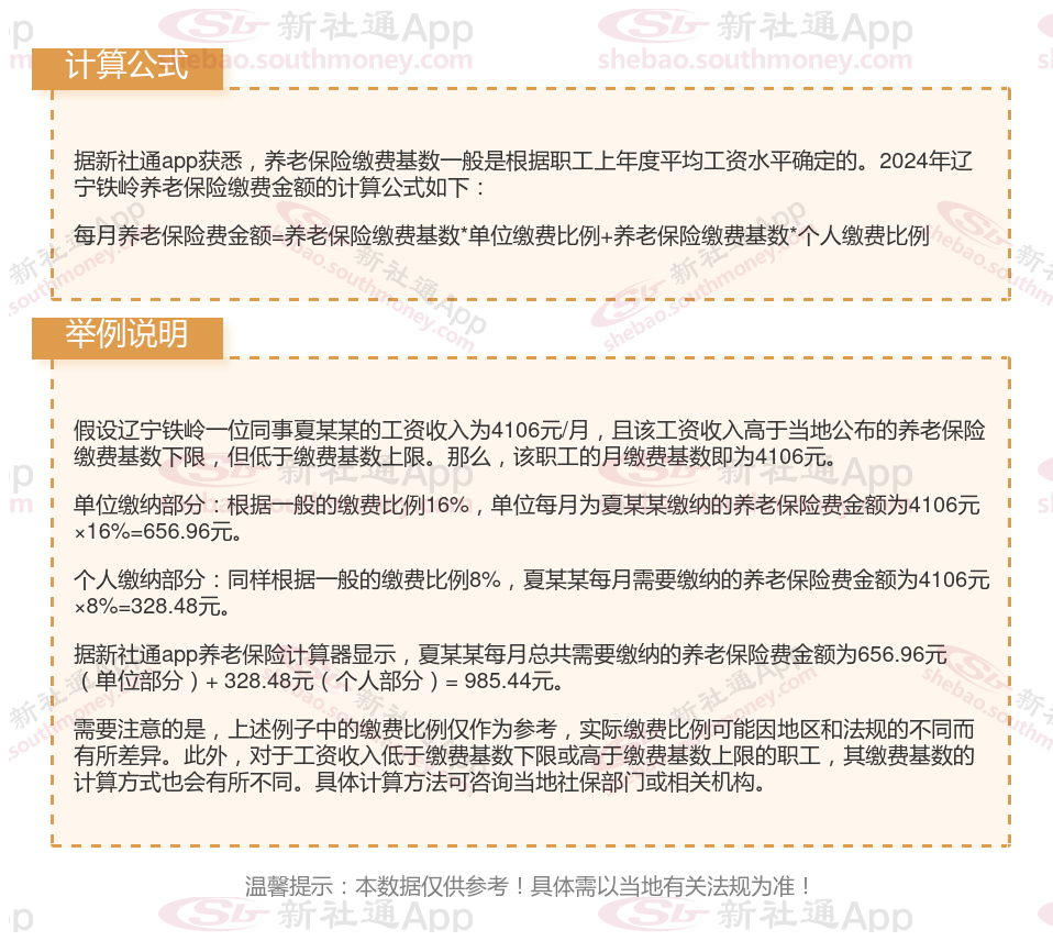 据新社通app显示,辽宁铁岭职工养老保险缴费基数2023-2024年最新标准如下: