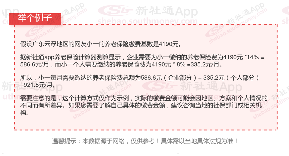 据新社通app显示,2023-2024年广东云浮职工养老保险的缴费标准是根据缴费基数来确定的: