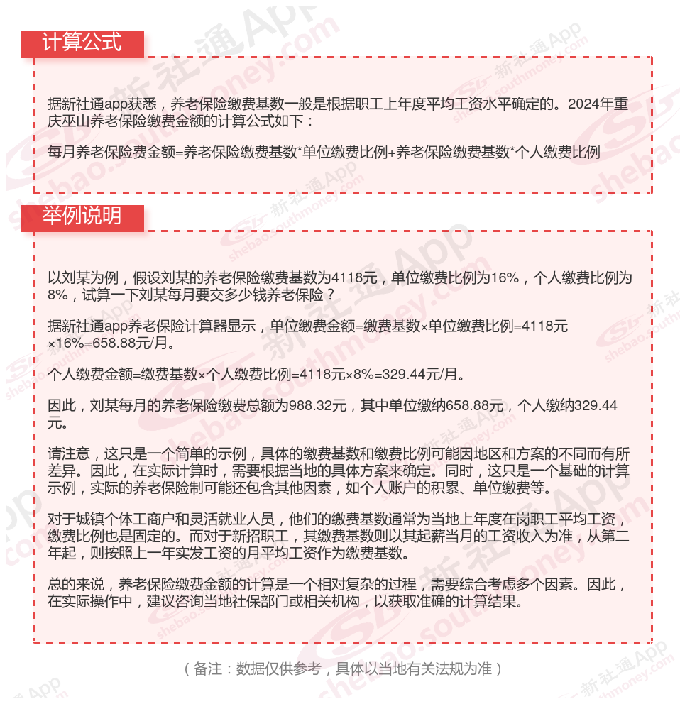 据新社通app显示,重庆巫山职工养老缴费基数2023-2024年最新标准是多少,重庆巫山养老保险基数明细如下: