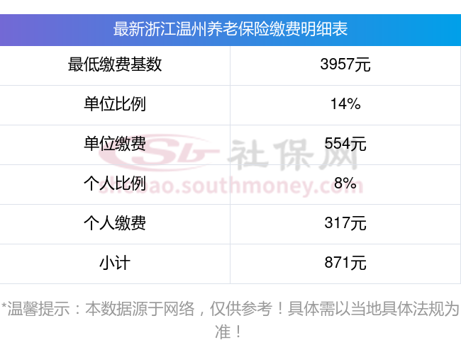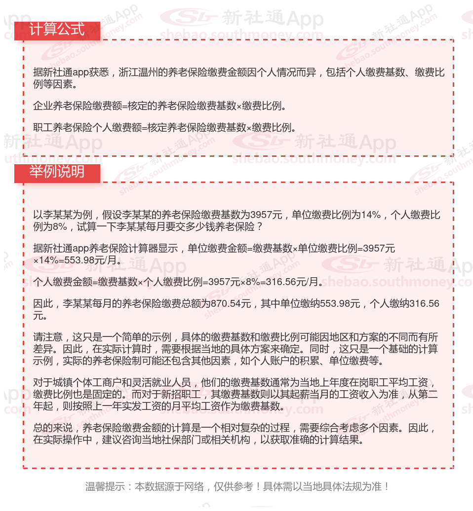 据新社通app获悉,养老保险是为居民退休后的经济来源提供保证的保险,对于单位职工而言,由用人单位和职工本人共同缴纳养老保险,保费较高;而居民的养老保险保费是由居民个人承担。不管是职工养老保险还是居民养老保险,保费都需要通过养老保险缴费基数计算得出。下面随新社通app小编一起来看看浙江温州养老金缴费标准2023-2024最新基数比例是多少!