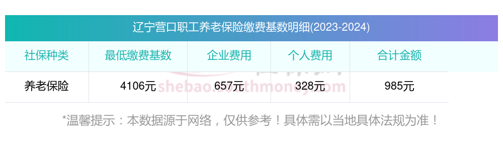 假设辽宁营口的养老保险缴费基数为4106元,个人按照8%的比例缴纳养老保险费用,企业按照16%的比例缴纳。则该职工的养老保险缴费计算如下: