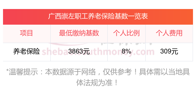 假设广西崇左某职工的工资总额为3863元,那么他的缴费基数就是3863元的60%到300%之间。如果他选择按照缴费基数为3863,据新社通app养老保险计算器测算显示,他的个人缴费额就是3863元*8%,等于309.04元。