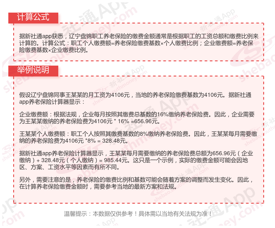 据新社通app养老保险计算器显示,辽宁盘锦职工基本养老保险缴费金额=个人养老保险缴费金额+单位养老保险缴费金额=328.48元+656.96元=985.44元