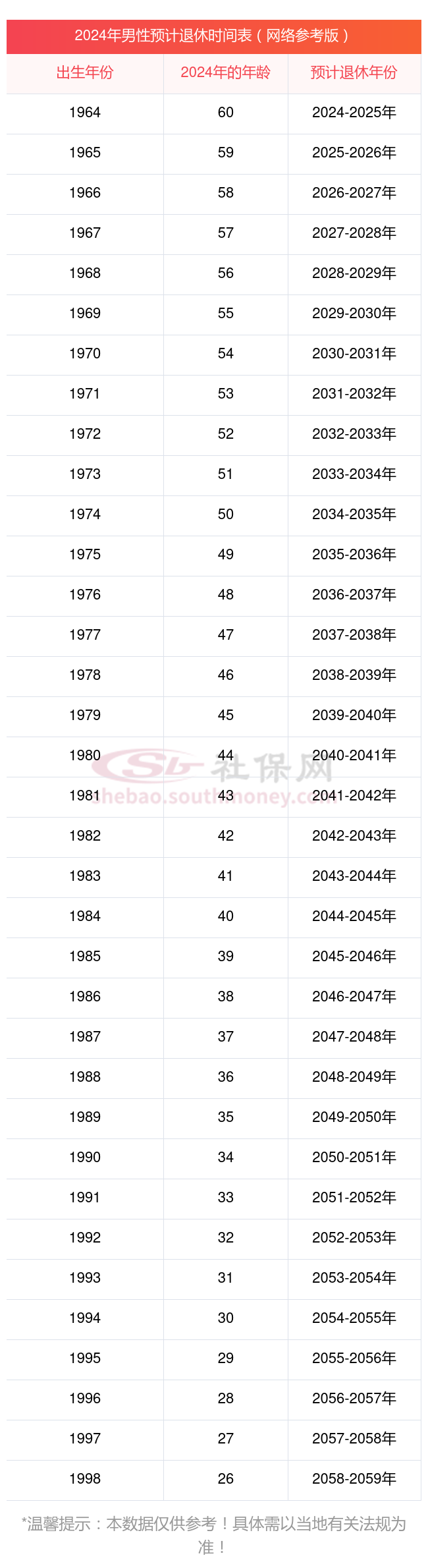 有网友整理了2024年最新男女退休年龄时间表(仅供参考)