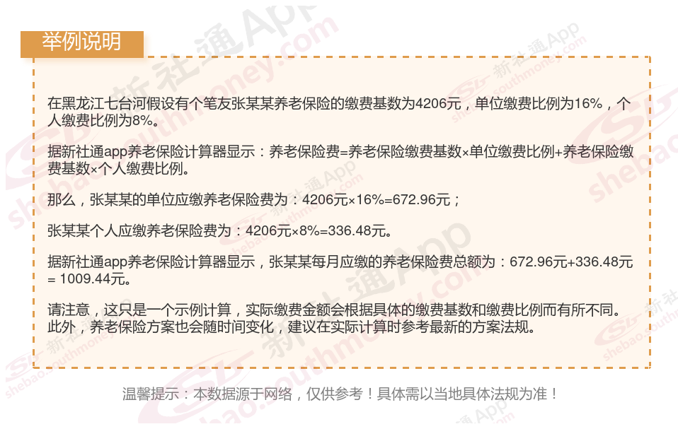 据新社通app显示,黑龙江七台河职工养老保险最低缴费基数为:4206元;单位和个人的缴费比例分别为:16%、8%;