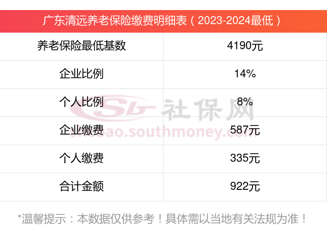 广东清远养老保险缴费基数2023-2024年最新标准(最低)