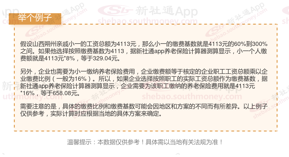 据新社通app显示,山西朔州企业职工养老保险的缴费基数为:4113元。