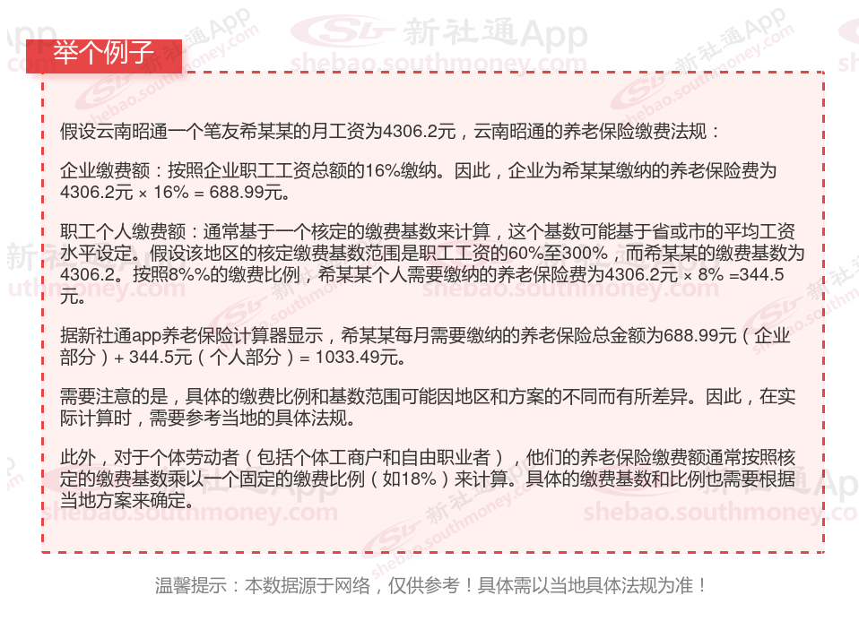 假设云南昭通某企业职工小明的月工资为4306.2元,当地的养老保险缴费基数为4306.2元。据新社通app养老保险计算器显示: