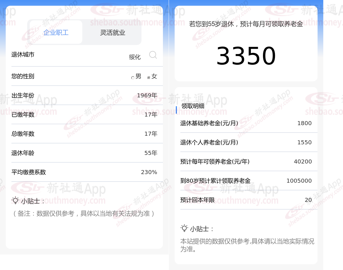 退休城市:黑龙江绥化,性别:女,出生年份:1969,总缴年数17年,缴费档次:230%,新社通app养老金计算器所得: