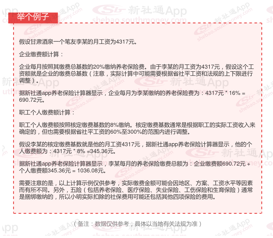 据新社通app获悉,甘肃酒泉养老保险缴费金额的计算主要依据缴费基数和缴费比例。以下是一个具体的计算举例: