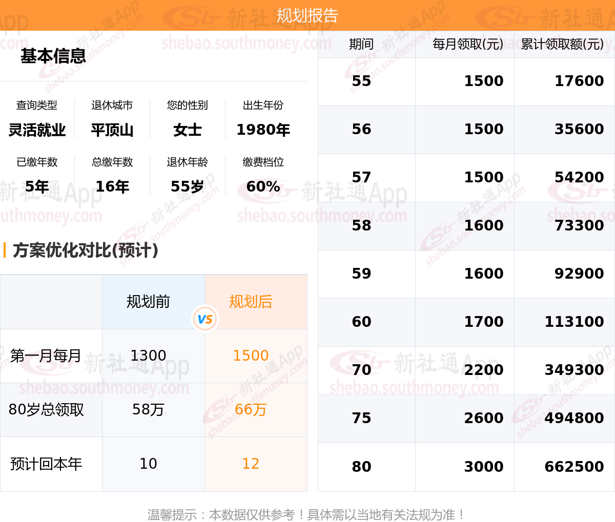 规划前:55岁第一个月约领1300元,新社通APP-养老金规划后:55岁第一个月约领1500元