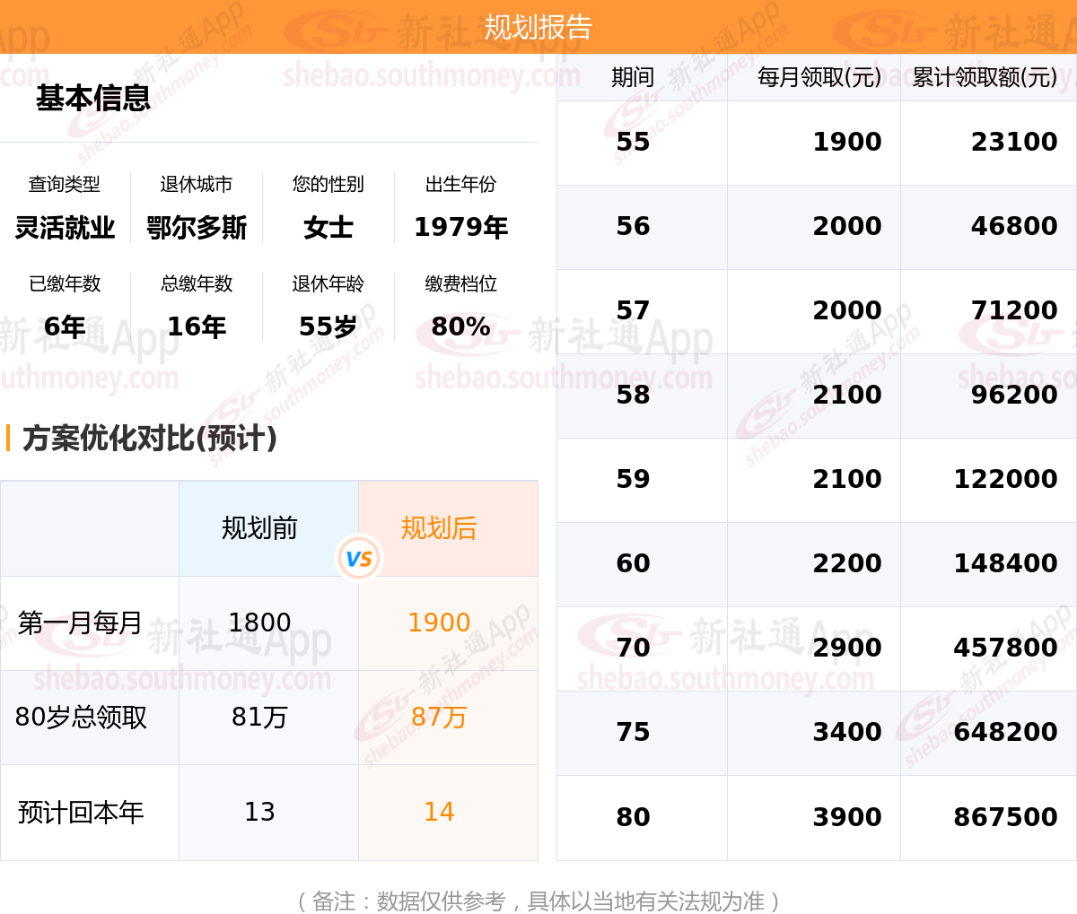 规划前:参保城市:内蒙古鄂尔多斯,性别:女士,出生年月:1979,已缴年限:6年,总缴年数:16年,退休年龄:55岁,缴费档位:80%。