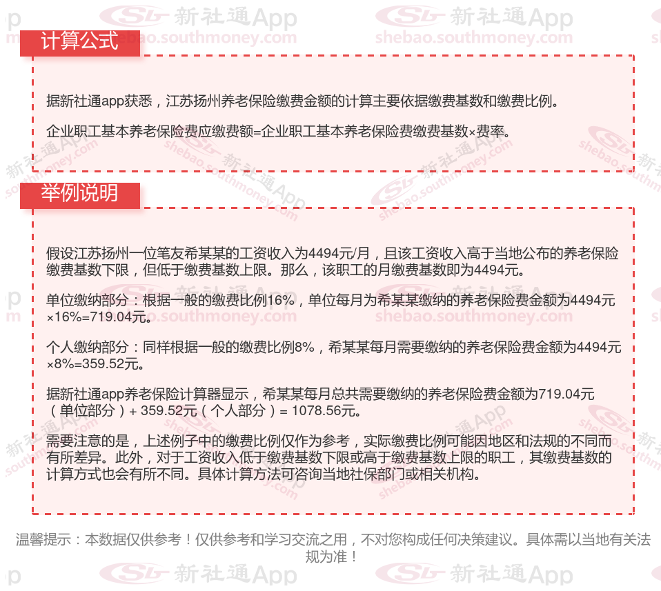据新社通app显示,2023-2024年江苏扬州职工养老保险的缴费标准是根据缴费基数来确定的: