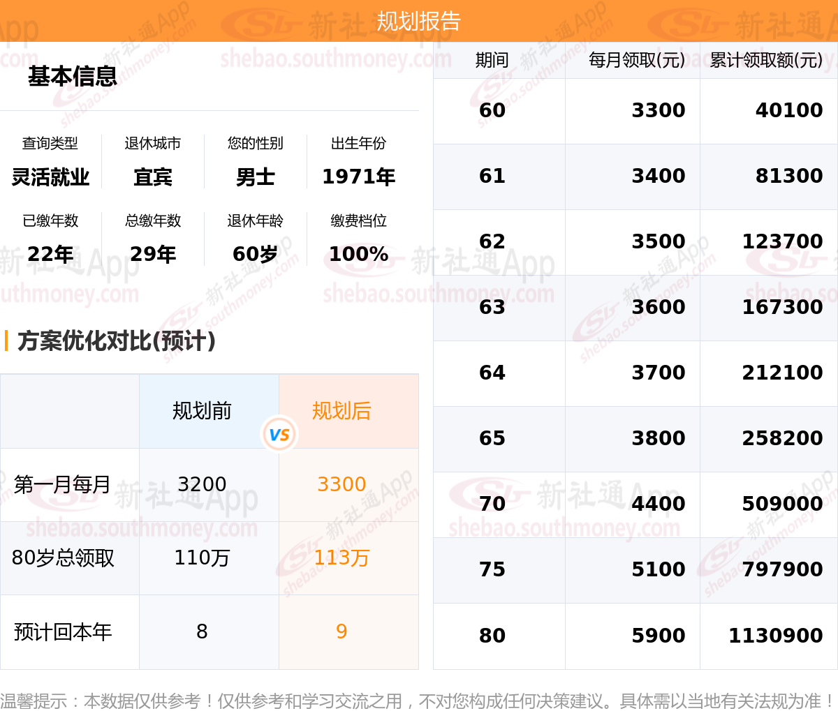 规划前:参保城市:四川宜宾,性别:男士,出生年月:1971,已缴年限:22年,总缴年数:29年,退休年龄:60岁,缴费档位:100%。