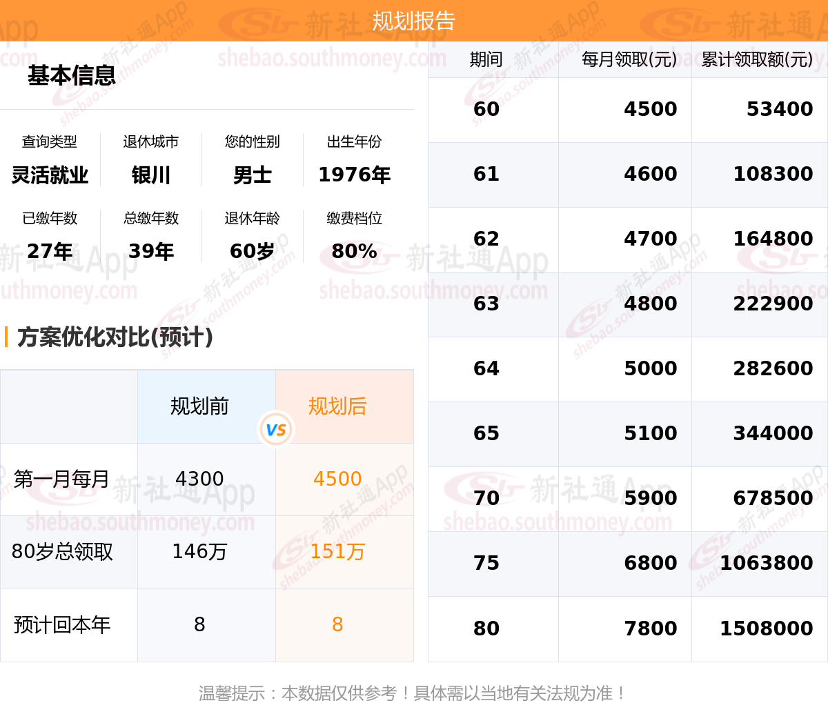 规划前:参保城市:宁夏银川,性别:男士,出生年月:1976,已缴年限:27年,总缴年数:39年,退休年龄:60岁,缴费档位:80%。