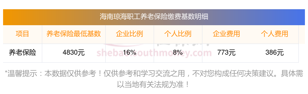 假设海南琼海某职工的养老保险缴费基数为4830元,企业缴费比例为16%,职工个人缴费比例为8%。