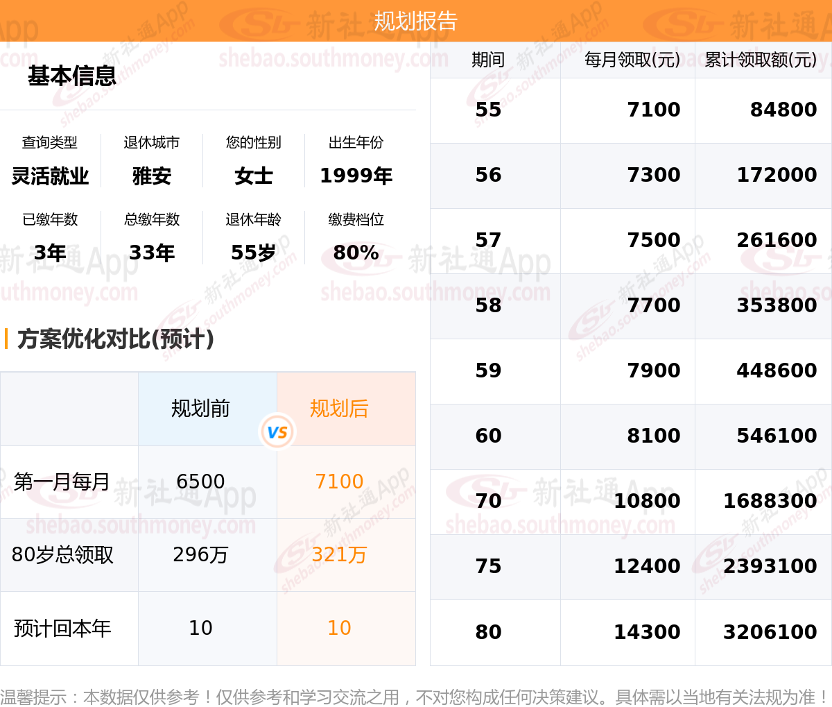 规划前:55岁第一个月约领6500元,新社通APP-养老金规划后:55岁第一个月约领7100元