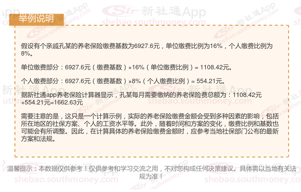 缴费基数下限暂按不低于6927.6元/月执行。按照单位16%+个人8%的缴费费率,单位和个人养老保险缴费金额分别不低于1108.42元/月、不低于554.21元/月。
