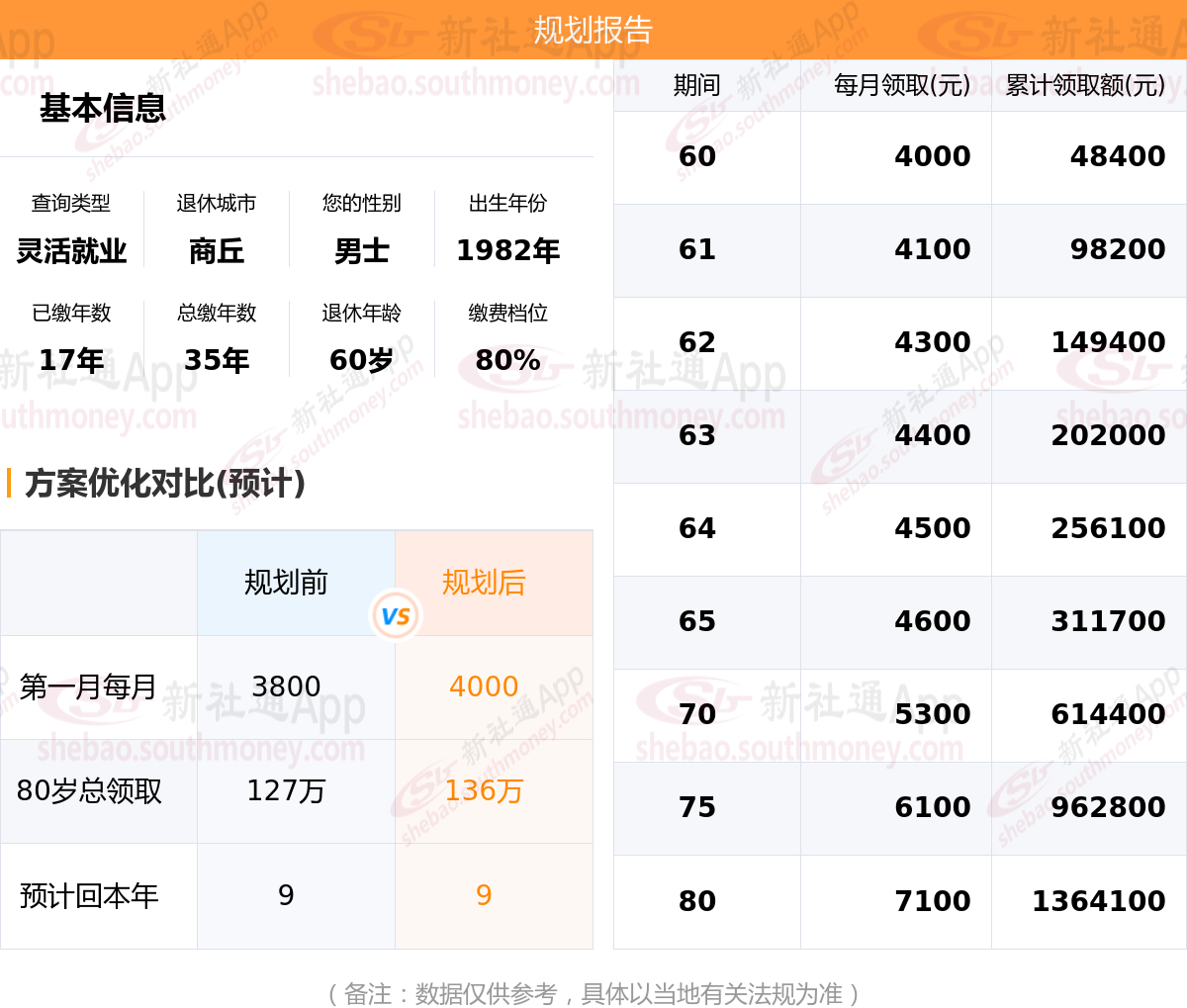规划前:60岁第一个月约领3800元,新社通APP-养老金规划后:60岁第一个月约领4000元