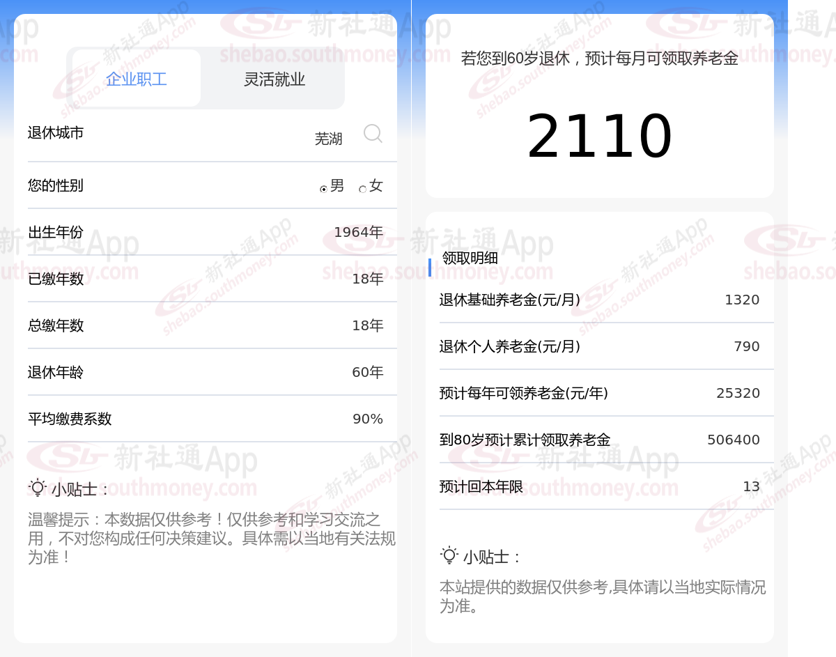 退休城市:安徽芜湖,性别:男,出生年份:1964,总缴年数18年,缴费档次:90%,新社通app养老金计算器所得:
