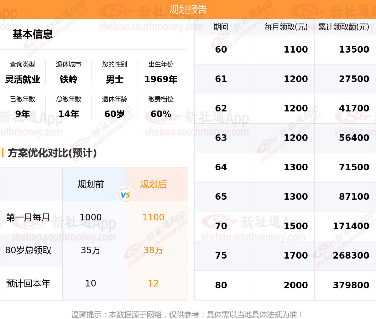 规划前:60岁退休后约领1000元,新社通APP-养老金规划后:60岁退休后约领1100元