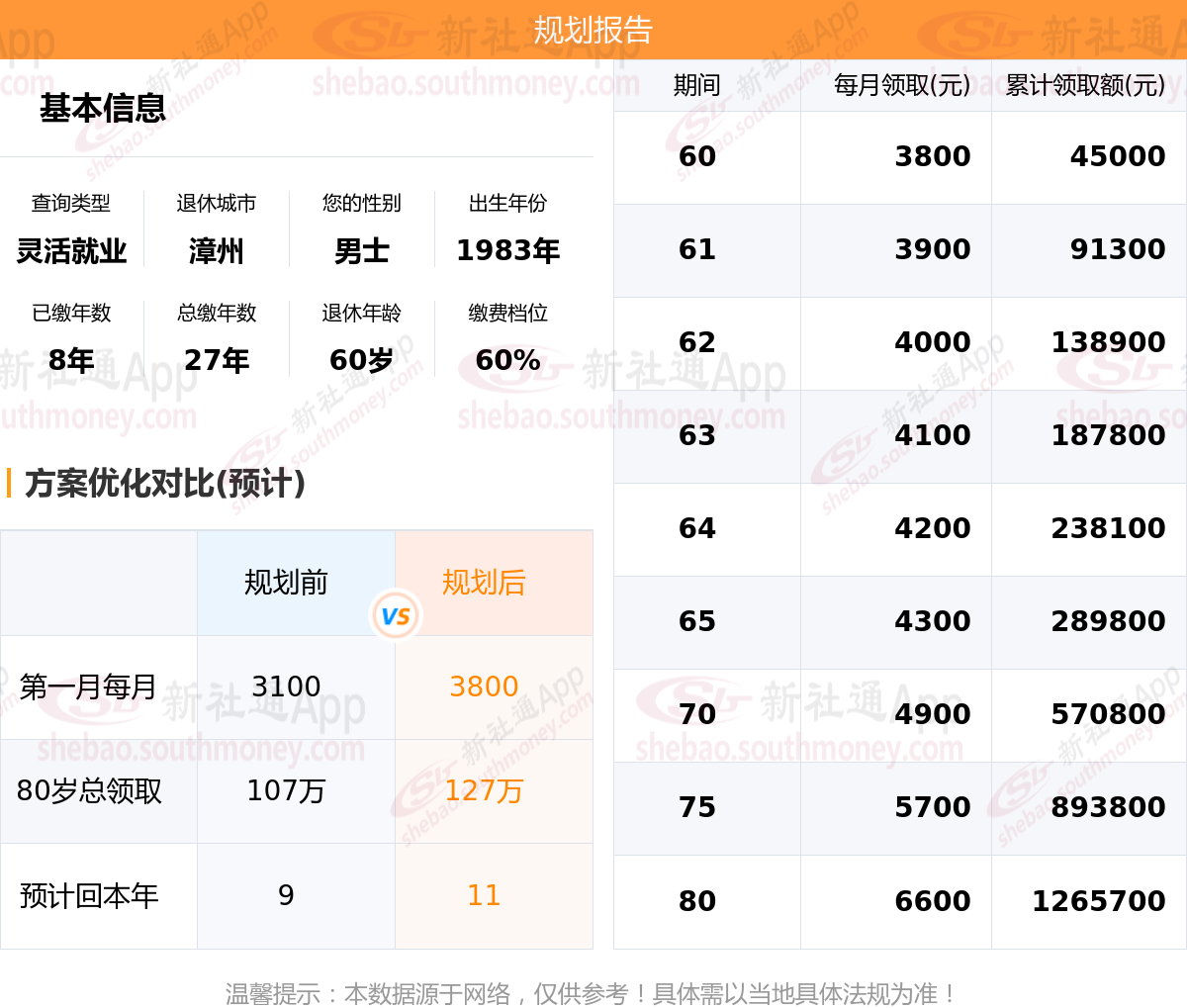 规划前:参保城市:福建漳州,性别:男士,出生年月:1983,已缴年限:8年,总缴年数:27年,退休年龄:60岁,缴费档位:60%。