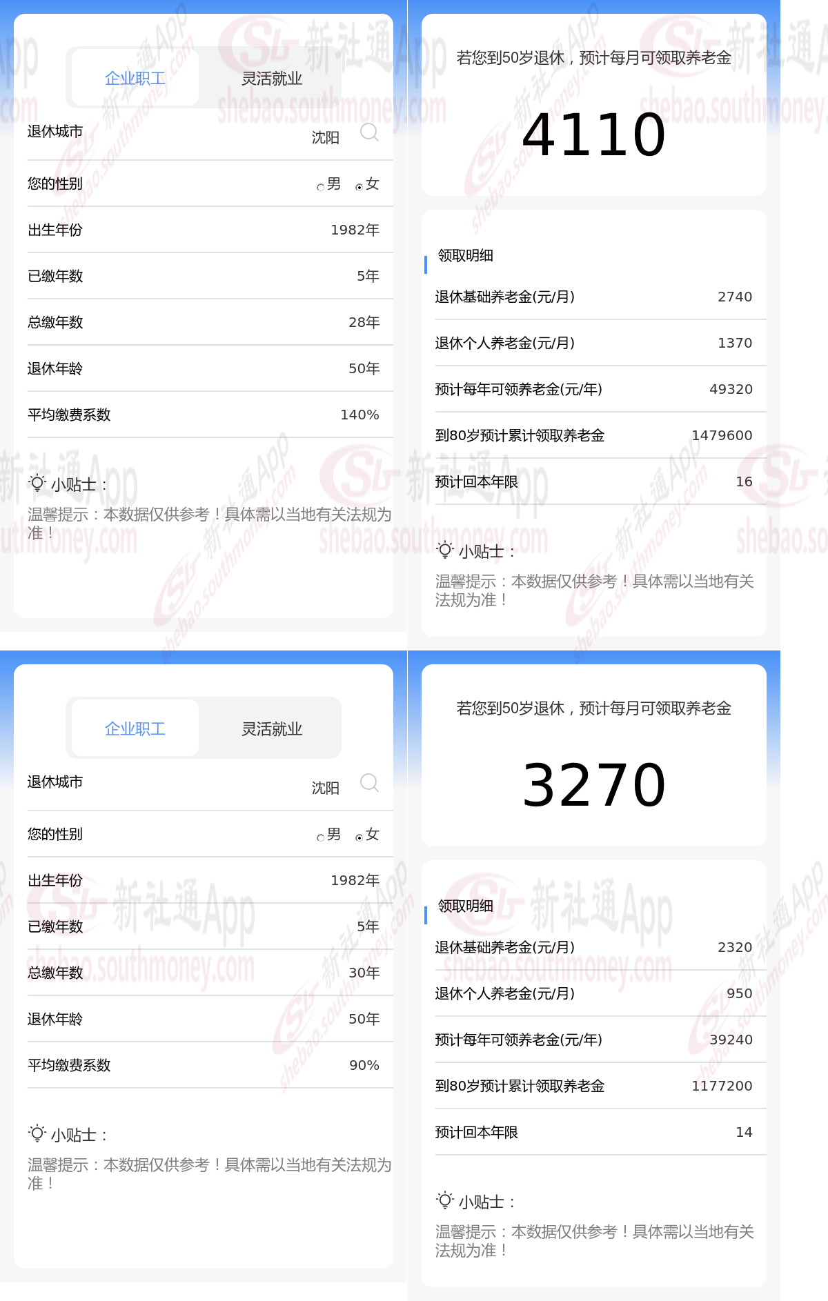 新社通app养老金计算器,轻松测算您的养老金!:两者相差4110-3270=840元。