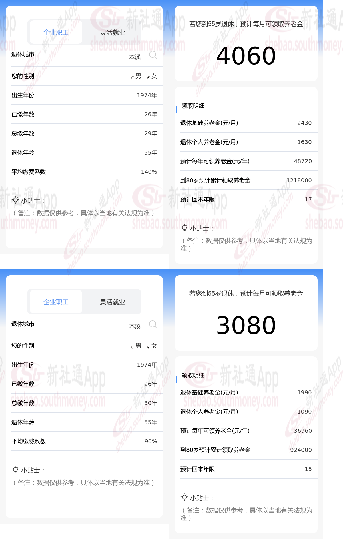 下面我们一起来看下,以辽宁本溪为例(不考虑过渡养老金):