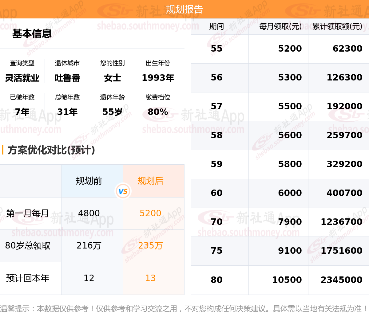 规划前:55岁退休后约领4800元,规划后:55岁退休后约领5200元