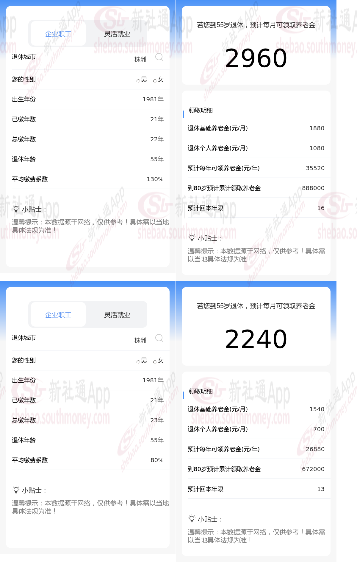 杜某某退休城市湖南株洲,社保缴费年限22年,55周岁退休,按130%缴费档位。