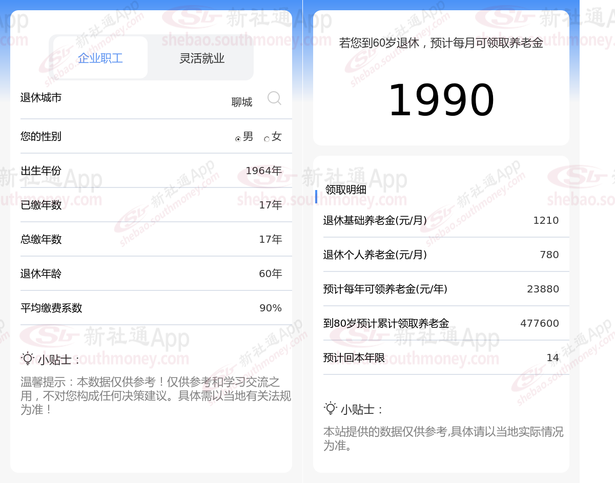 退休城市:山东聊城,性别:男,出生年份:1964,总缴年数17年,缴费档次:90%,新社通app养老金计算器所得: