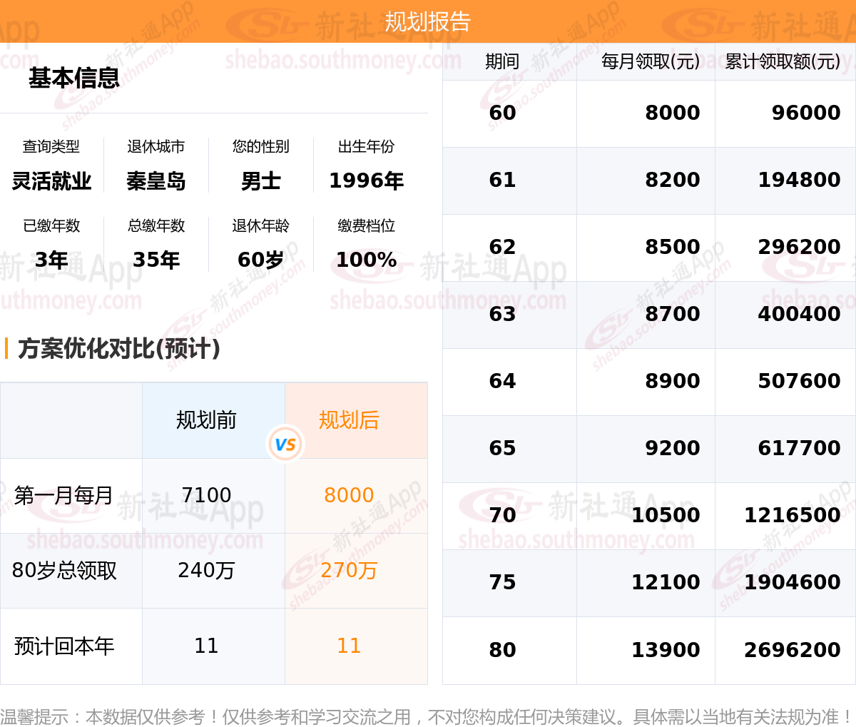 规划前:60岁第一个月约领7100元,新社通APP-养老金规划后:60岁第一个月约领8000元